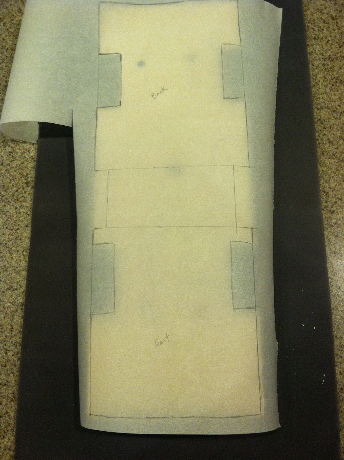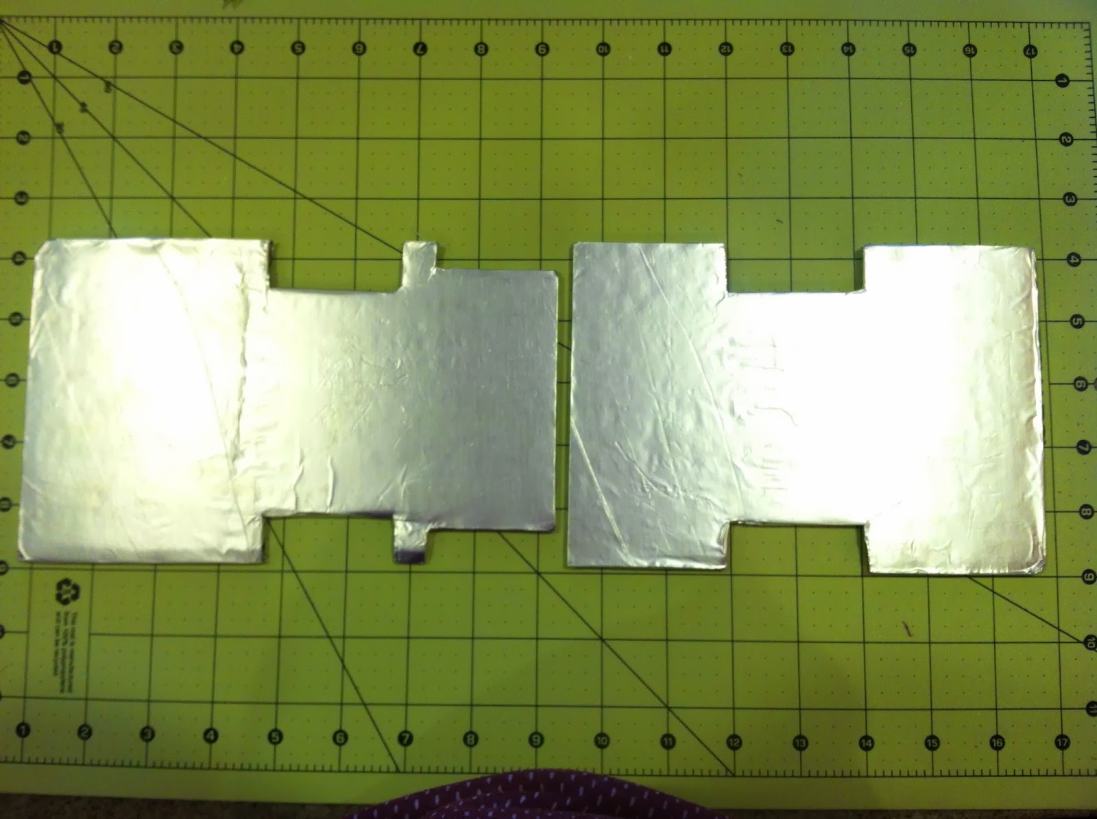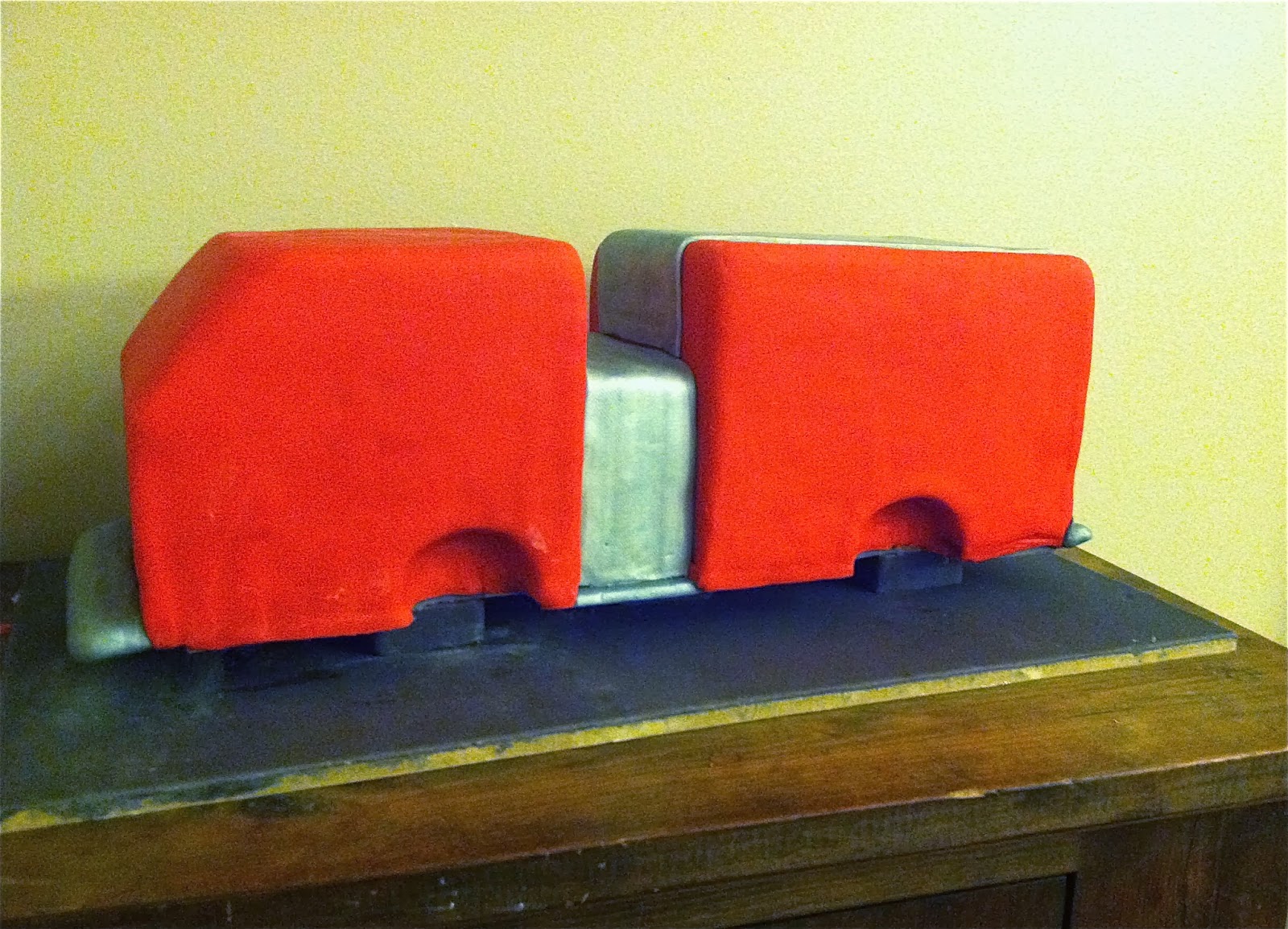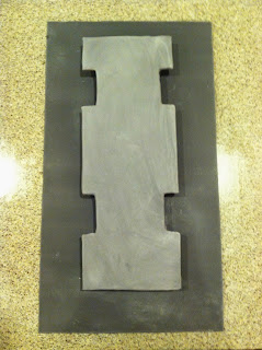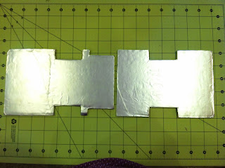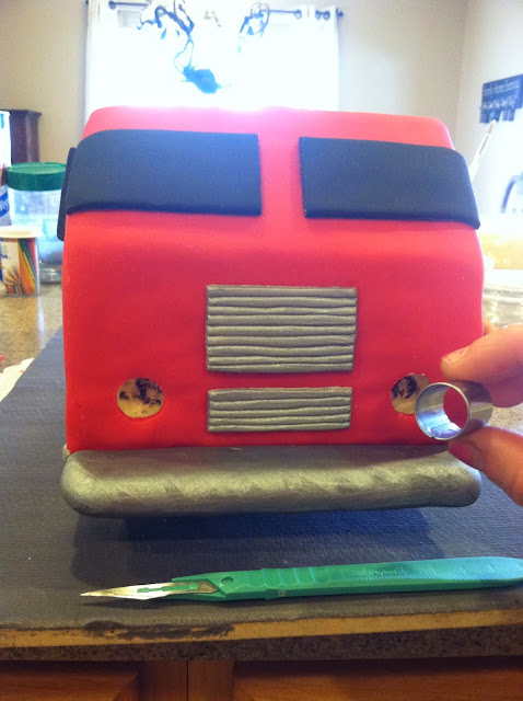 Use your template to cut a piece of cardboard (this would be typically called your cake board in a more simple scenario) to form your cake on. Cover it with foil (I use Elmer's Spray Adhesive to attach my foil to the cardboard). I used my drawn measurements, and also added about 1" onto the front of my cake board, and .5" on the back in order to extend beyond the cake and create the look of bumpers. I opted to fondant and assemble my cake in two sections: the front and middle, and the back. I though it would be too challenging to fondant it all at once.