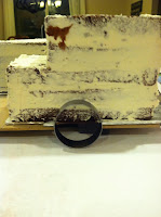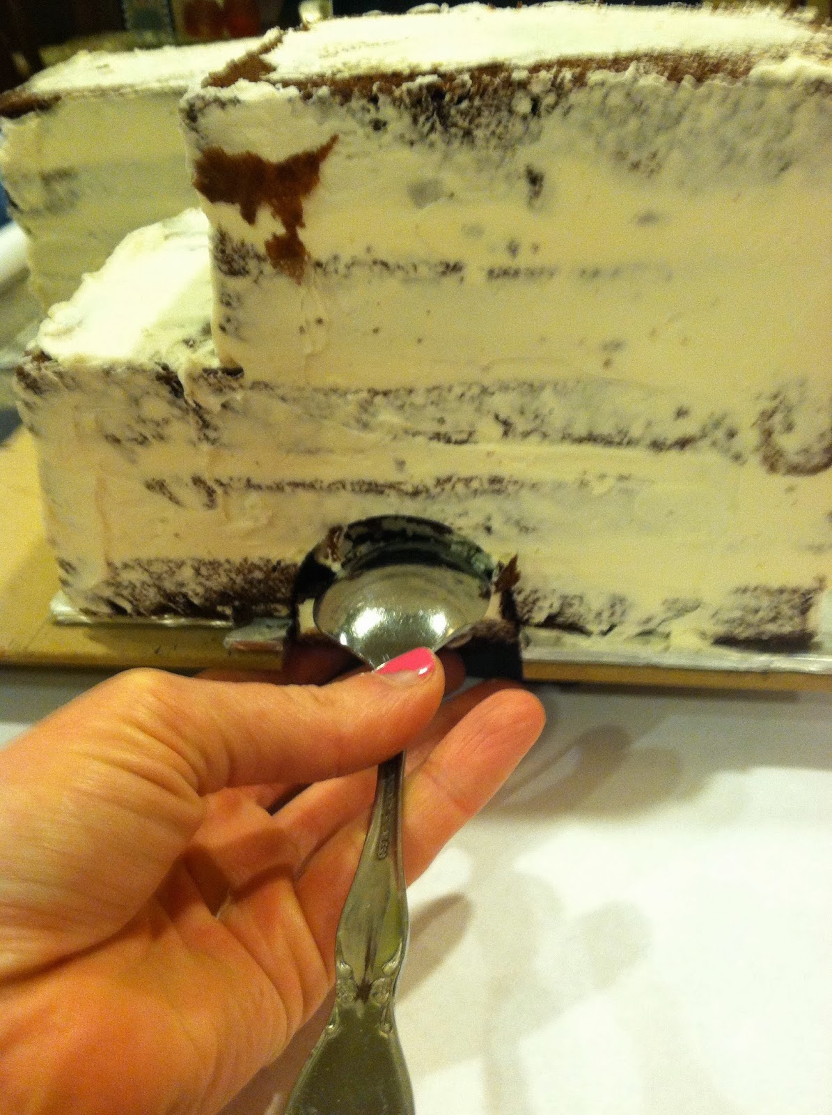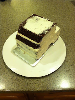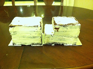 Also equally important, either cut down your template or your cake a bit less than 1/4" on all sides. This gives room for the buttercream so that when you fondant the cake, the sides are plumb with the base board. I stacked my cake 5 layers high, so cut 5 of each. You may need to piece together one of the layers with large scraps. Just hide that one 2nd from the top. Crumbcoat your two peices, and place in the fridge to firm up. I used Swiss Meringue Buttercream--the best to use under fondant, and scrumptious to boot!