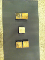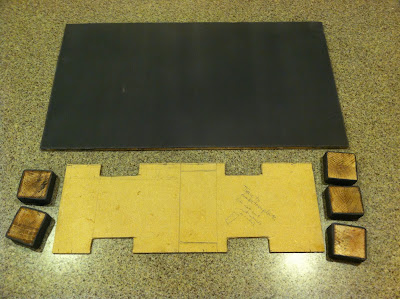For the bases, I used two thickness of MDF board, that can be purchased at Home Depot, and I even had them cut to size there! The thicker base goes on the bottom, and the thinner base acts as your cake support--I'll call that piece the "cake board." I used some wood scraps cut into 2" squares to support and elevate the cake.