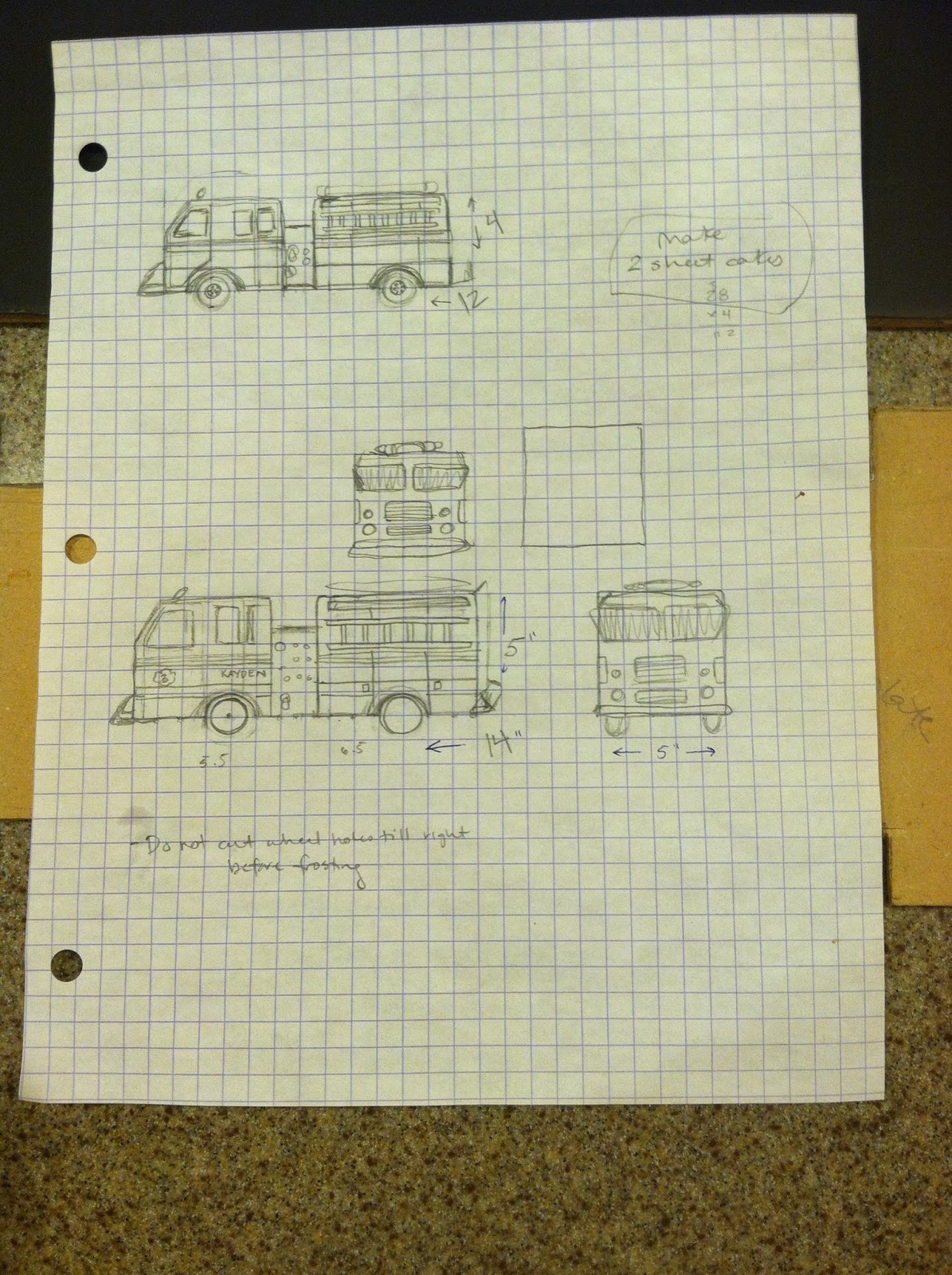 To start, your most crucial step: I sketched out the design onto graph paper, with each square representing one real-life square inch. This enabled me to have exact measurements and proportions ahead of time, necessary since I needed to make my gumpaste ladders and other accessories in advance (so they had time to dry, and so that I wasn't pulling all-nighters at the last minute). The wheels aren't pictured, but those should be made in advance as well (more on those later). My sketch told me exactly how long, and how wide those accessories should be in order to be to scale once placed on my finished cake. I referred to this sketch during the entire process.