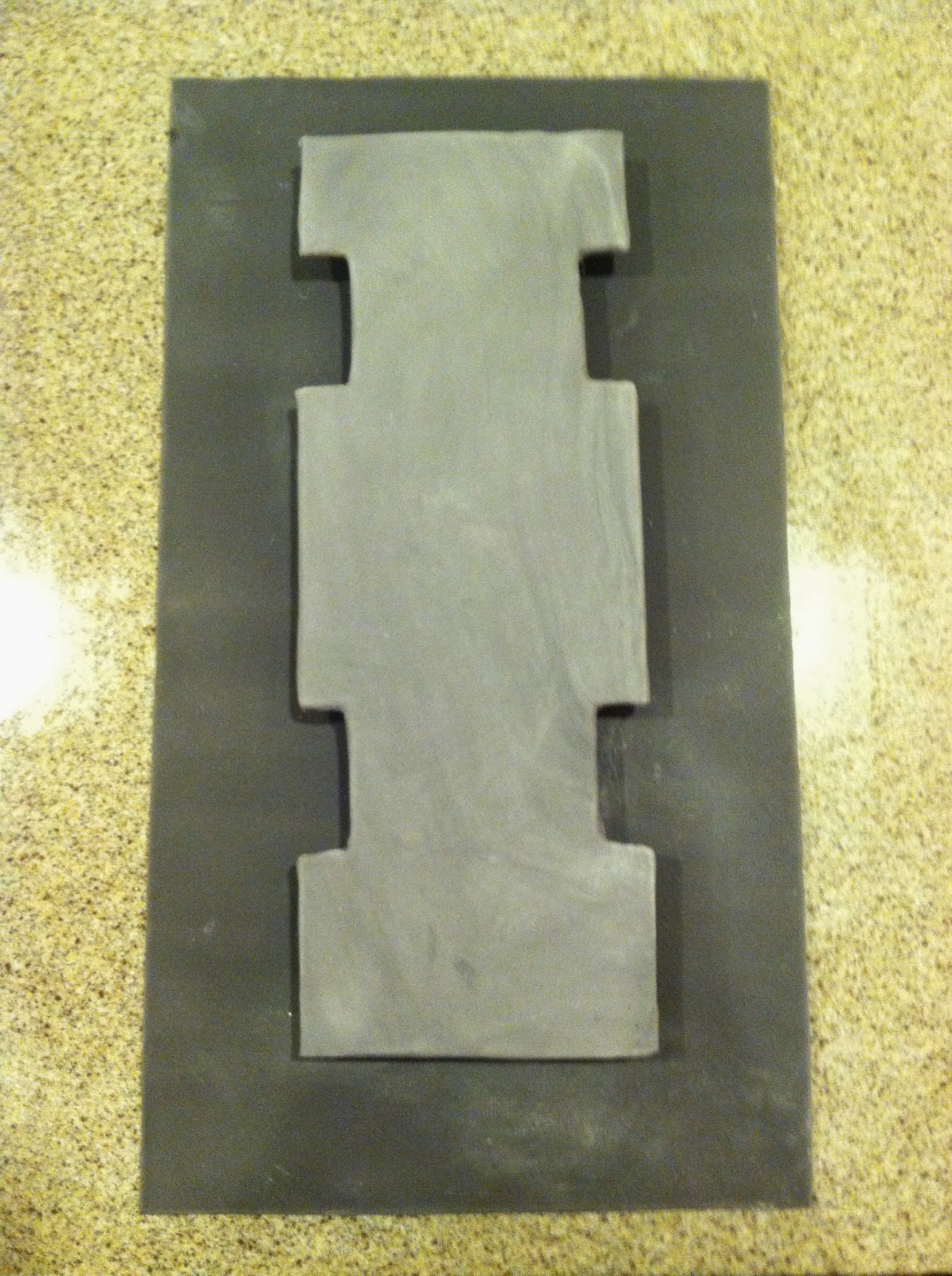 Before progressing further, make sure to make a template for carving your cake and cutting your cardboard to go under your cake! You could do this at any point up till now. Using parchment, I traced my shape precisely. You'll notice the inner section is to be 1/2" shorter on each side than the board. Cover your cake board in fondant. This adds a food-safe barrier, and when wet, provides a sticky surface to hold attach to the cardboard that your cake will be on. Also, it will show on the inner segment, where the cake is 1/2" shorter.