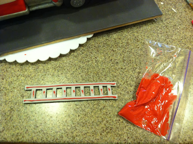 The ladders and grills were cut using a #2 disposable scalpel, a ruler, and a pizza cutter. For round elements, I used my piping tips of varying sizes. Always punch out your shapes, rather than cut by hand, whenever possible! This gives smoother lines and more perfect shapes. I used a combination of Wilton silver food coloring spray and silver lustre dust mixed with lemon extract (or cheap vodka) to paint the silver elements. Details were drawn in with a Wilton food coloring pen. The ladder rungs, etc, were glued together using a small paint brush and piping gel. For the housing for the lights on top, attach a strip of white to 2 smaller strips of red on each side, and fold around a pen or dowel so as to create a housing large enough to fit the lights in. Hide competed accessories high, away from the kiddos, and allow to dry for several days. If using all gumpaste, even 24 hours would suffice.