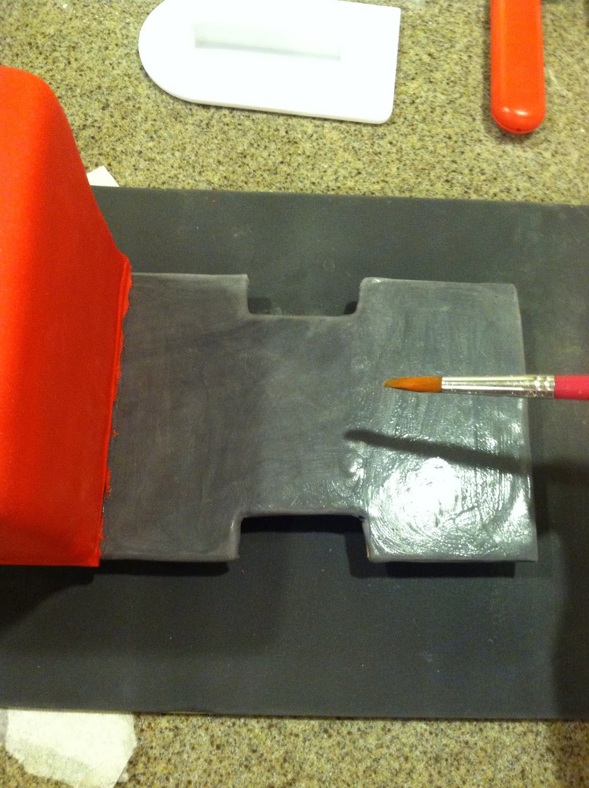 I left the back side of the middle section uncovered, so as to not add any more thickness in between the middle and the back piece, or it wouldn't fit on my base well. Also, the buttercream will stick to the fondanted back piece, adding more stability. I trimmed my fondant, leaving a small lip to hang down over the wooden cake board. Wet your fondant-covered cake-board, and place your two cakes on it, making sure wheel wells and edges line up. Smooth fondant edges over the cake board, then trim any extra with your X-acto Knife or disposable scalpel.
