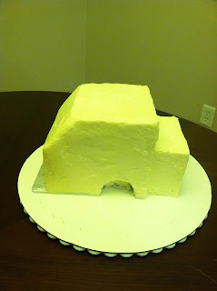 Using your paper template, carve your cake--Ignore the wheel wells. I repeat, DO NOT cut in the marked wheel wells! Your cake should be rectangular, with no notches cut in. The mid-section attached to the front will be a shorter width. I was terrified I was going to forget this important detail. You'll do that later!