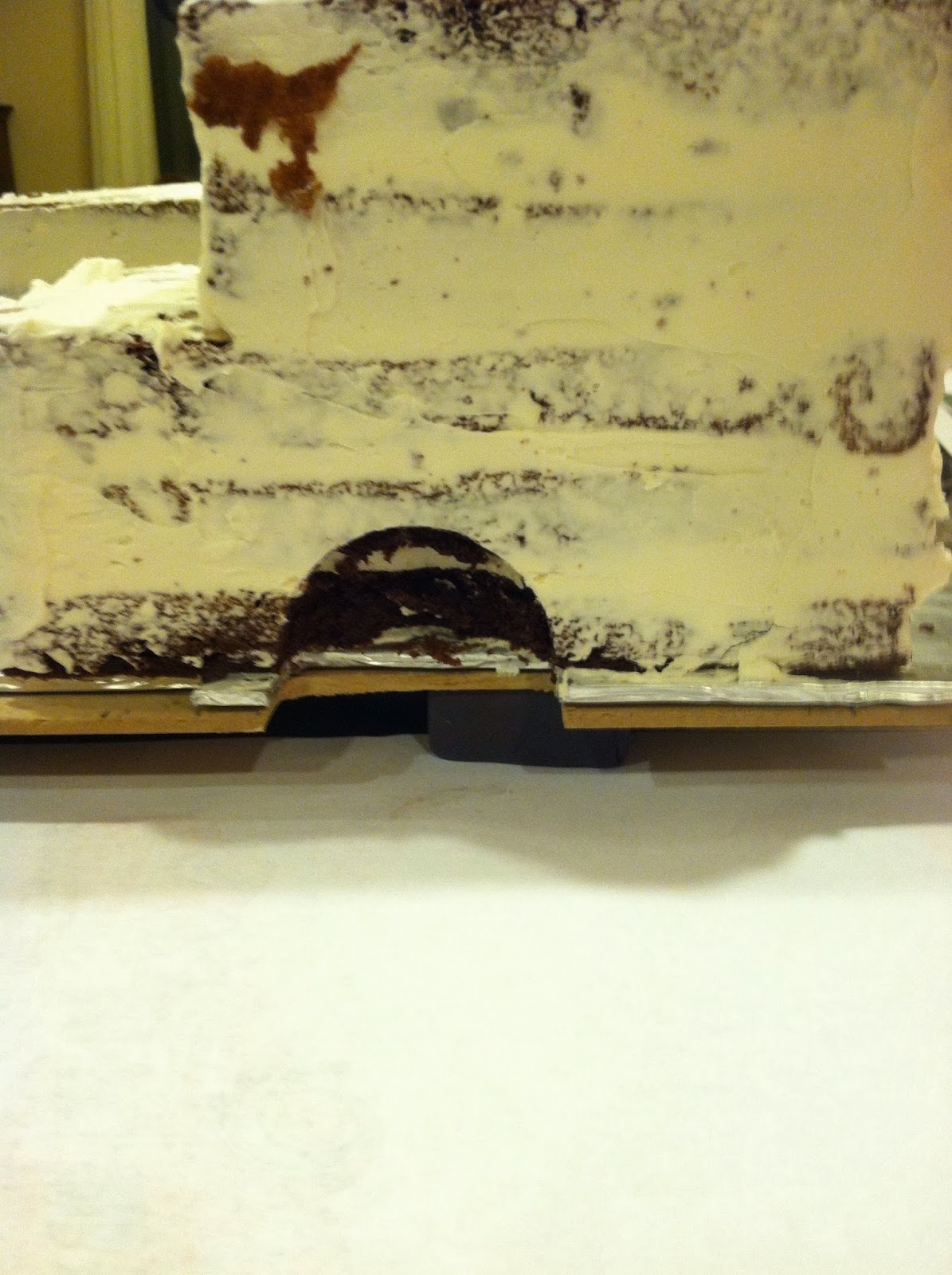 Finish carving your cake, referring to your drawing, and apply your final buttercream coat. In the left below photo, you can see I haven't yet carved down the width of what will be the smaller midsection. In the photo on the right, you can see it's been carved down, shorter than the width of the baseboard. Once frosted, your edges of the cake should be even with the edges of the cardboard. Firm in fridge again for 10 - 20 min, and you're ready to fondant!